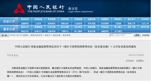 12月27日,中国人民银行发布消息,为推动形成银行卡清算市场开放新格局,健全银行卡清算业务监管制度,中国人民银行、国家金融监督管理总局组织修订《银行卡清算机构管理办法》(中国人民银行中国银行业监督管理委员会令〔2016〕第2号发布,下称《办法》),形成《银行卡清算机构管理办法(征求意见稿)》,现向社会公开征求意见,意见反馈截止时间为2025年1月27日。